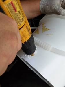 - Install the bit onto a drill and turn the drill on. Press it against the chosen location to create a hole in the bucket for the faucet. Turn the drill off and remove.
